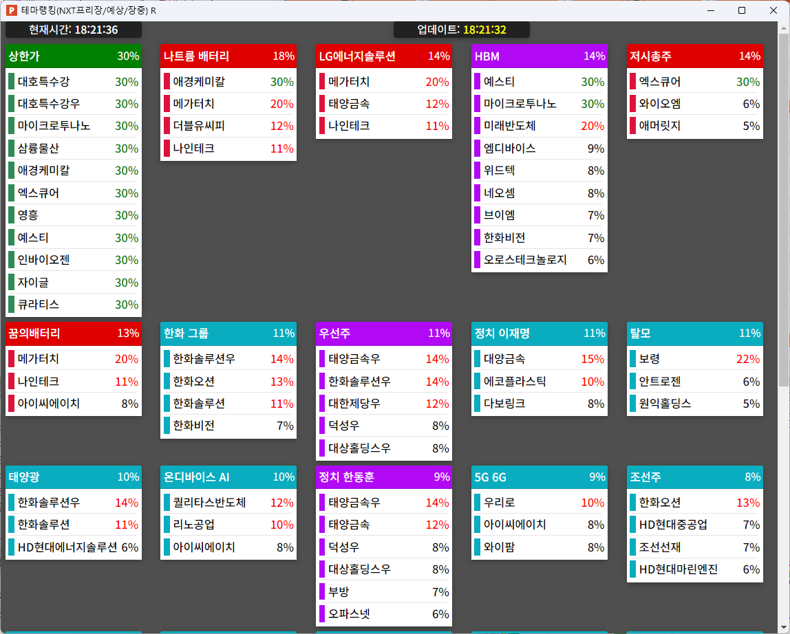 24. 태양금속(11.71%) : 한동훈 국민의힘 대선 경선 후보 적합도 1위 소식 등에 정치/ 인맥(한동훈) 테마 상승 속 급등