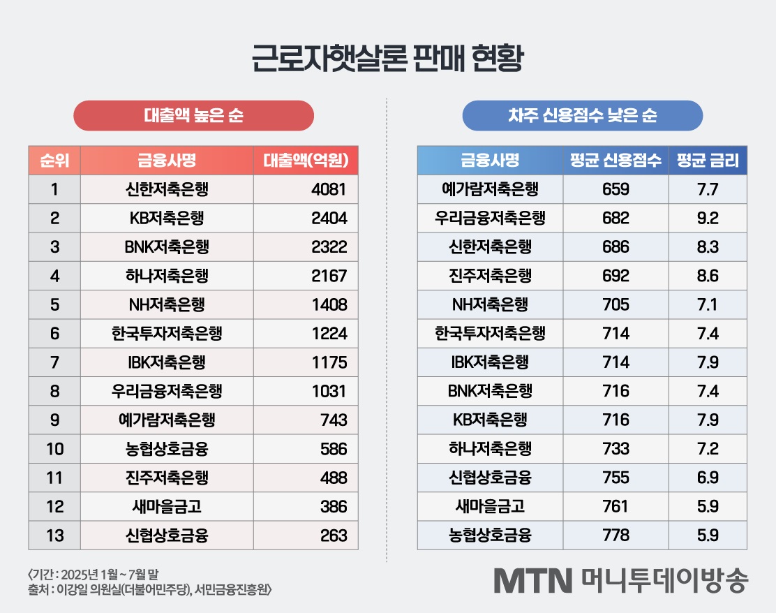 저소득·저신용 근로자를 위한 대출 상품 '근로자햇살론'을 올해 가장 많이 내준 금융사는 신한저축은행인 것으로 확인됐다.동일한 상품임에도 어느 곳에서 대출을 받는지에 따라 금리가 3 |