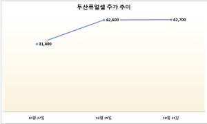 [서울=뉴스핌] 이나영 기자= 두산퓨얼셀이 대규모 공급 계약 체결 소식에 강세를 보이고 있다.22일 한국거래소에 따르면 오전 10시 02분 기준 두산퓨얼셀은 전 거래일보다 28.. |