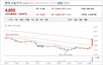 반도체 공정용 화학소재 기업 램테크놀러지 주가가 장 초반 급등세다. 15일 오전 9시21분 |