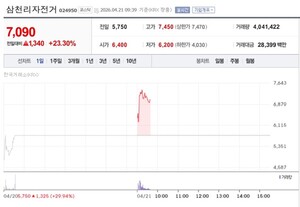 삼천리자전거가 거래 재개 이틀째 강세다. 21일 한국거래소에 따르면 이날 오전 10시 53분 삼천리자전거는 전 거래일 대비 1010원(17.57%) 오른 6760원에 거래되고 |