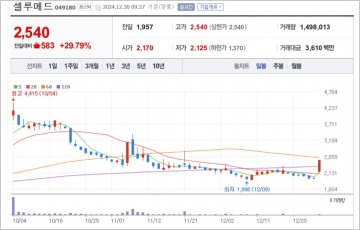 30일 오후 2시 49분 기준 셀루메드는 전 거래일보다 29.79%(583원) 가격제한폭까 |