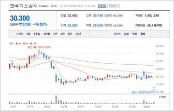 |   | 한국가스공사 주가가 하락세를 보이고 있다. 7일 오전 10시 29분 기준 현재 전 거래일 대비 -12.83% 내린 3만 900원에 거래되고 있다. 거래량은 294만 517주다. 이 |