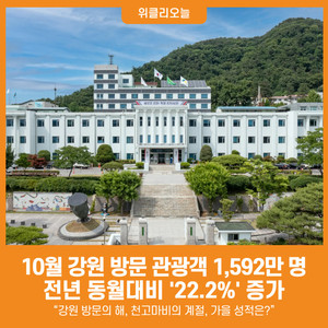 [강원 위클리오늘=박종국 기자] 강원특별자치도와 강원관광재단은 빅데이터 기반의 강원관광 동향분석을 통해 강원특별자치도를 방문한 10월 관광객은 전년 동월 대비 22.2%, 전월 대