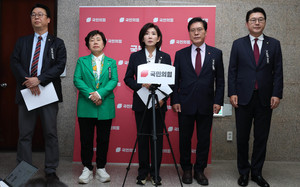 (서울=국제뉴스) 국민의힘 나경원 등 법제사법위원회 위원들이 16일 서울 여의도 국회에서 법사위 국장감사 진행상황 관련 기자회견을 하고 있다. ./사진=이용우기자