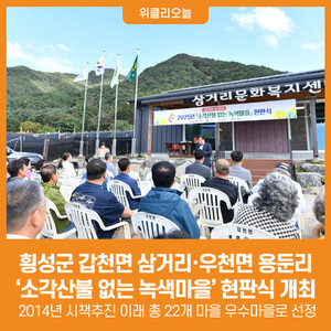 [강원 위클리오늘=박종국 기자] 횡성군은 15일 갑천면 삼거리 마을회관에서 16일 우천면 용둔리 마을회관에서 “2025년 소각산불 없는 녹색마을” 현판식을 개최했다.이날 행사에는