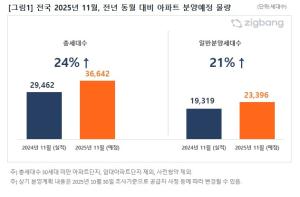 연말이 가까워지면서 건설사들이 연내 공급 일정을 서두르고 있다.3일 직방에 따르면 이달 전국 아파트 공급 물량은 총 3만6642가구로, 지난해 11월 2만9462가구 보다 24%