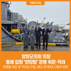 [강원 위클리오늘=박종국 기자] 양양군의회는 10월 14일, 동해에 입항한 해군5전단 제52전대 소속 ‘양양함’을 방문해 장병들을 위문하고 격려금을 전달하고, 해군 제1함대 사령부