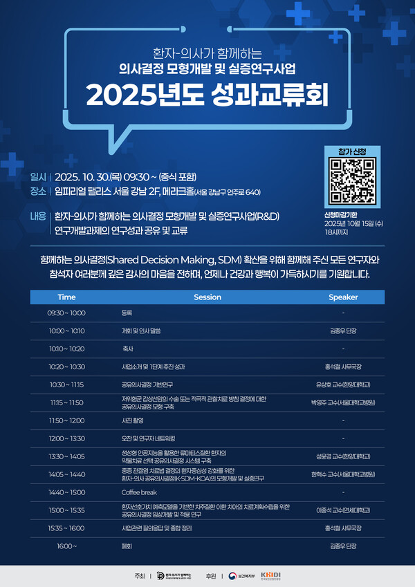 경희의료원(원장 오주형) ‘환자-의사 공유 의사결정 모형개발 및 실증연구사업단’은 오는 10월 30일(목) 오전 9시 30분부터 서울 강남 임피리얼 팰리스 호텔에서 성과 교류회를