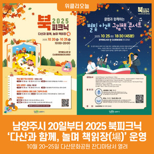 [경기 위클리오늘=박종국 기자] 남양주시는 10월 20일부터 25일까지 6일간 정약용도서관 앞 다산문화공원 잔디마당에서 ‘2025 북피크닉: 다산과 함께, 놀며 책읽장(場)’을 운