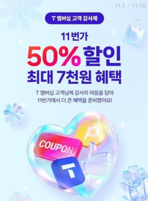 온라인 쇼핑몰 11번가는 SK텔레콤과 협업해 T 멤버십 고객 대상 50% 할인 혜택을 제공하는 ‘T 멤버십 고객 감사제’ 프로모션을 실시한다고 지난달 31일 밝혔다.행사는 다음 달