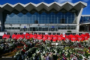 A photo shows flowers and heart-shaped signs bearing the names of victims layed outside the station
