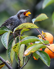 가을을 재촉하는 비가 내리는 14일 오전 제주시 연동의 한 감나무 위로 직박구리가 날아와 먹이활동을 하고 있다.기상청에 따르면 이날 제주에는 5~40mm의 비가 내리면서 흐린 날씨