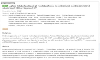 알테오젠은 미국 파트너사 머크(MSD)가 수행한 키트루다 피하주사(SC) 제형에 대한 선호도 조사 임상 결과 초록이 공개됐다고 14일 밝혔다.이번 임상(NCT06099782)은 흑