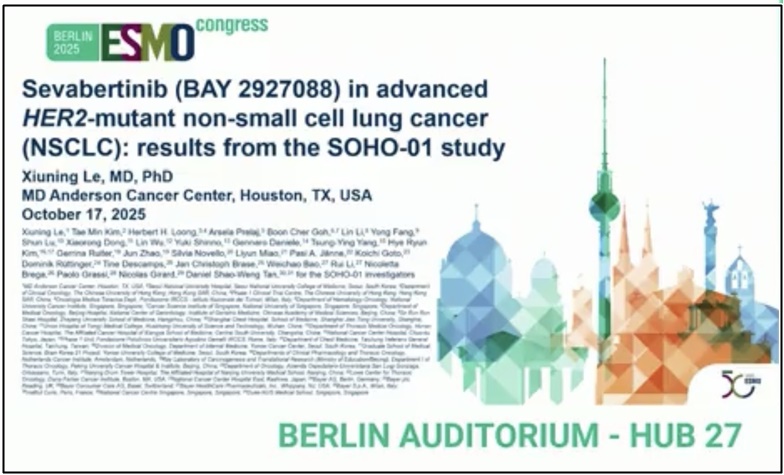 [메디칼타임즈=문성호 기자]ESMO 2025에서 HER2 양성 비소세포폐암 환자를 대상으로 세바버티닙(Sevabertinib)을 평가한 임상 1/2상 SOHO-01 연구(LBA 7