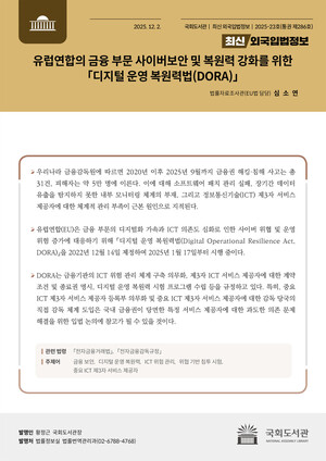 [뉴스웍스=박광하 기자] 국회도서관이 2일 'EU의 금융 부문 사이버보안 및 복원력 강화를 위한 디지털 운영 복원력법(DORA)'을 주제로 '최신외국입법정보'를 발간했다.보고서는