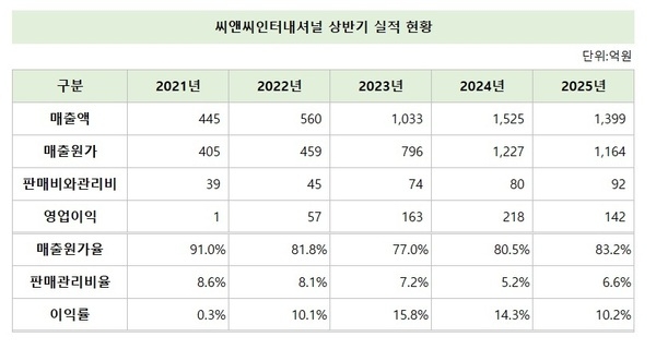 화장품 ODM(제조자개발생산)사 가운데 눈에 띄게 성장세를 거두던 씨앤씨인터내셔널이 올 상반기 들어 뒷걸음질했다. 매출과 영업이익 모두 두 자릿수 하락세를 보이며, 2021년 상장