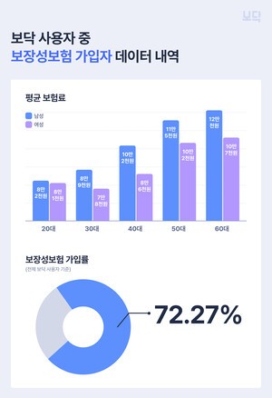 [서울=뉴스핌] 이나영 기자= 인슈어테크 전문기업 아이지넷은 10월 말 기준 자사 AI 보험 진단 플랫폼 '보닥' 사용자의 보험 가입 데이터를 분석한 결과, 전체 사용자 중 72.