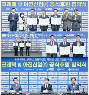 [대구=뉴스핌] 김용락 기자= 2026대구세계마스터즈육상경기대회 조직위원회(이하 조직위)는 지난 1일 대구광역시청 동인청사에서 지역 우량기업인 크레텍 및 아진산업㈜과 공식 후원 협