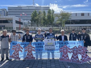 (전북=국제뉴스) 박호정 기자 = 전북특별자치도의회 초고압 송전선로 대책 특별위원회(위원장 염영선)는 15일 용산 대통령실 앞과 국회의원회관에서 각각 국가기간전력망 지정 규탄 공동