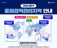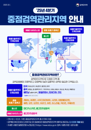 질병관리청(청장 임승관)이 해외감염병 발생 동향과 위험평가를 반영해 2025년 4분기 중점검역관리지역과 검역관리지역을 지정하고, 10월 1일부터 시행한다고 ...