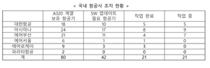 국토교통부는 유럽항공안전청(EASA)이 긴급 발행한 소프트웨어 긴급 교체 지시와 관련, 조치 대상 항공기 42대 중 21대가 작업을 완료한 것으로 확인됐다고 29일 밝혔다.국토부는