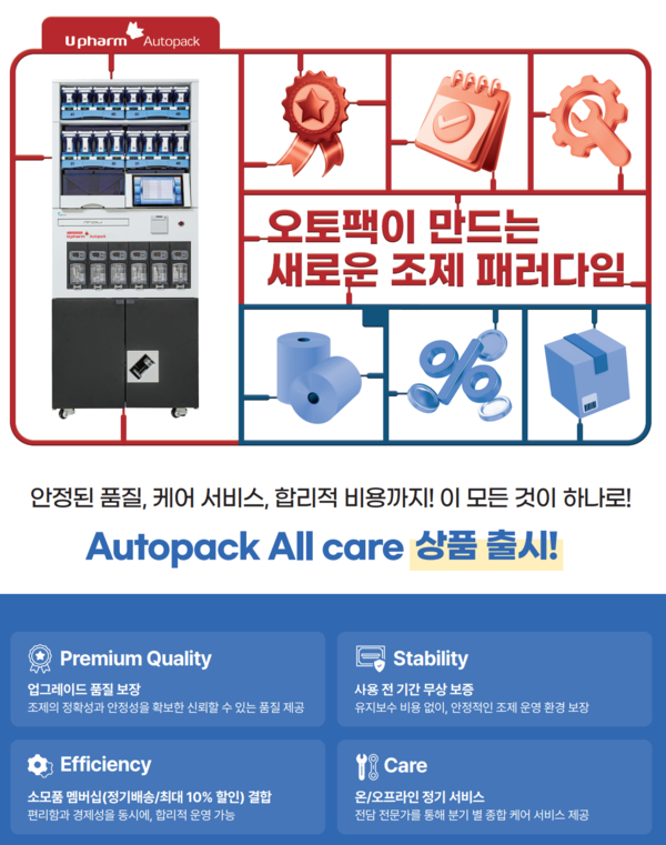 유비케어가 약 포장 조제 자동화 장비인 ‘오토팩(Autopack)’의 신규 상품 ‘오토팩 All care’를 출시한다고 1일 밝혔다.이번 상품은 장비 공급에 더해 ▲업그레이드된 품