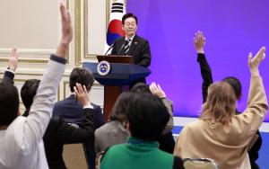 이재명 대통령이 3일 비상계엄 1년을 맞아 연 외신기자 간담회에서 원자력추진잠수함과 핵무장