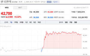 [뉴스웍스=김아현 기자] 한국전력이 외국인 투자자들의 대량 순매수 소식에 강세를 보였다.17일 한국거래소에 따르면 한국전력은 전일 대비 2500원(6.22%) 상승한 4만2700원