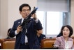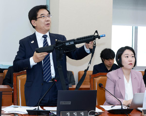 (서울=국제뉴스) 정일영 더불어민주당 의원이 29일 서울 여의도 국회에서 열린 기획재정위원회의 한국은행 등에 대한 국정감사에서 총포류 관련 질의를 하며 BB탄총을 들어보이고 있다.
