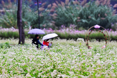 추석 연휴인 6일 오전, 가을비가 촉촉이 내리는 경남 하동군 북천면의 코스모스·메밀꽃 단지에는 흐린 날씨에도 가을의 정취를 즐기려는 탐방객들의 발걸음이 이어졌다. 비에 젖은 꽃잎은