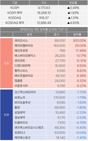 코스닥 제약·바이오 지수가 전날에 이어 13일에도 5% 가까이 오르며 이틀 연속 강세를 이어갔다. 에이비엘바이오는 이틀 연속 상한가를 기록했고, 같은 날 코스닥에 상장한 큐리오시스