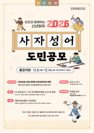 [강원 위클리오늘=박종국 기자] 강원특별자치도는 2026년 병오년(丙午年) 새해를 앞두고, 도정 운영 방향에 대한 도민의 바람을 담은 ‘올해의 사자성어’를 도민 공모를 통해 선정한