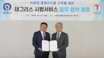 [서울=뉴스핌] 이경화 기자 = 서울시메트로9호선㈜은 27일 ㈜티머니와 '차세대 결제시스템 구축을 위한 태그리스(Tagless) 시범서비스 업무협약(MOU)'을 ...