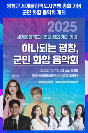 강원 평창군은 2025 세계올림픽도시연맹 총회 개최를 기념하여 오는 17일 오후 5시, 평창올림픽플라자 잔디광장에서 ‘하나 되는 평창, 군민 화합 음악회’를 개최한다고 밝혔다. 이