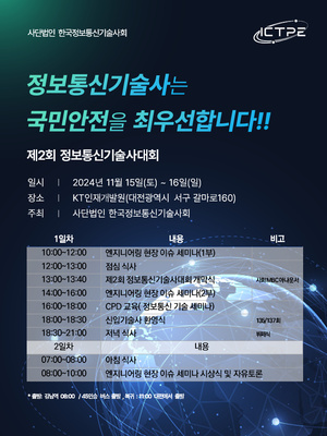 [뉴스웍스=박광하 기자] 한국정보통신기술사회(ICTPE)가 11월 15~16일 대전 서구 KT인재개발원에서 '제2회 정보통신기술사대회'를 개최한다고 22일 발표했다.대회는 정보통신