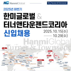 한미글로벌·터너앤타운젠드코리아 2025년 하반기 신입사원 채용한미글로벌은 2025년도 하반기 신입사원 채용을 실시한다고 15일 밝혔다. 접수 기간은 이달 29일까지다.이번 채용은