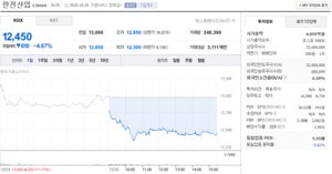 [중앙이코노미뉴스 이상민] 30일 KRX 마감 기준, 네이버페이 증권에 따르면 한전산업은 12,450원에 지난 종가 13,060원 대비 610원 하락한 채 거래를 마쳤다. 하락률은