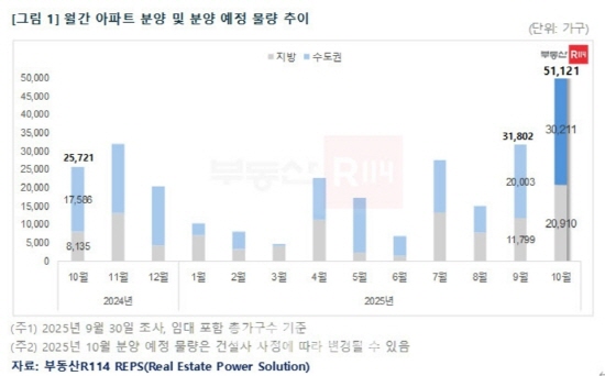 추석 이후 전국에 5만 가구 아파트 분양 물량이 쏟아질 전망이다.6일 부동산R114에 따르면 이번 달 전국 아파트 57개 단지서 5만1121가구 분양을 진행한다. 이는 2021년