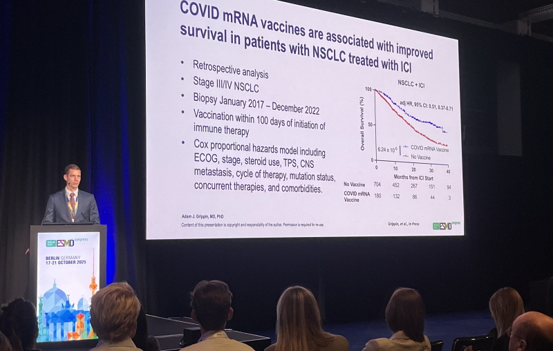 [메디칼타임즈=이인복 기자][ESMO 2025=독일 베를린]면역 관문 억제제(Immune checkpoint therapy, ICT)를 시작한 뒤 100일 안에 코로나 백신으로 알