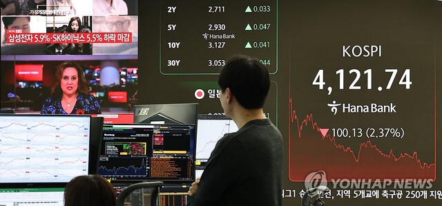 [아시아타임즈=김지호 기자] 코스피지수가 2%대로 하락했다. 4일 코스피는 전장보다 100.13포인트(2.37%) 내린 4121.74로 장을 마쳤다. 지수는 전장보다 2.63포인트