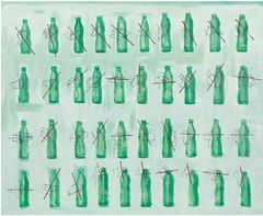 정수진의 회화는 감정이 폭발하지 않는다. 초록빛 병들이 병렬되어 있지만, 그것은 단순한 반복이 아니다. 선이 교차하고 색이 번지는 그 미세한 틈에서, 감정은 폭발하지 않고 잔향처럼