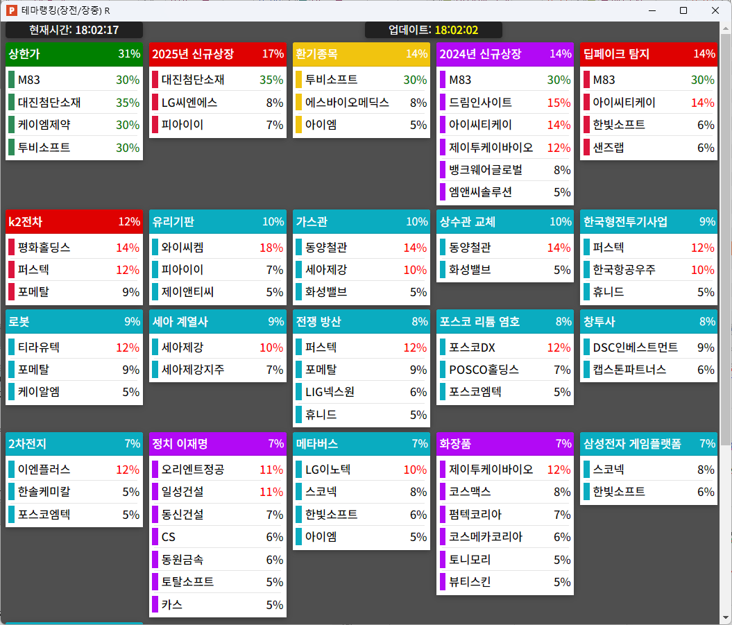 17. 퍼스텍(11.85%) : 우주항공산업(누리호/인공위성 등), 방위산업/전쟁 및 테러테마 상승 속 급등