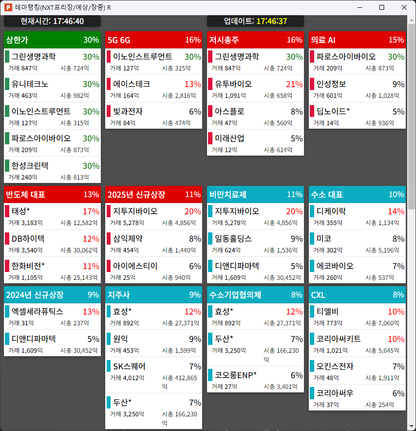 26. 한화비전(10.22%) : 반도체 관련주 및 일부 지주사 테마 상승 속 급등